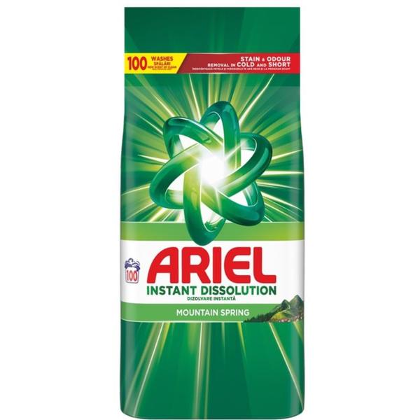 Detergent Automat Pudra - Ariel Instant Dissolution Mountain Spring, 100 spalari, 6.5 kg: detergent pudra pentru rufe, creat pentru a oferi o curatare profunda chiar si in spalari scurte sau la temperaturi reduse. Formula Instant Dissolution se activeaza rapid in apa, eliminand murdaria, petele dificile si mirosurile neplacute fara a lasa reziduuri pe haine. Patrunde eficient in fibra tesaturilor si protejeaza intesitatea culorilor, mentinand aspectul impecabil al rufelor la fiecare spalare. Parfumul fresh „Mountain Spring” confera textilelor o senzatie de prospetime curata. Potrivit pentru uz zilnic si pentru orice tip de masina de spalat.