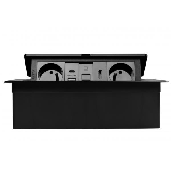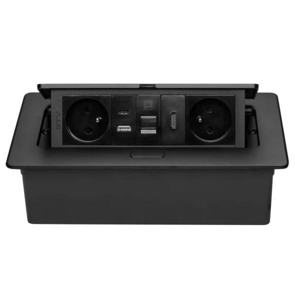 Priza incorporabila in blat Multi Soft, cu 2 prize Schuko, 2 porturi incarcare USB tip A + C, 1 port HDMI si 1 port RJ45, finisaj negru