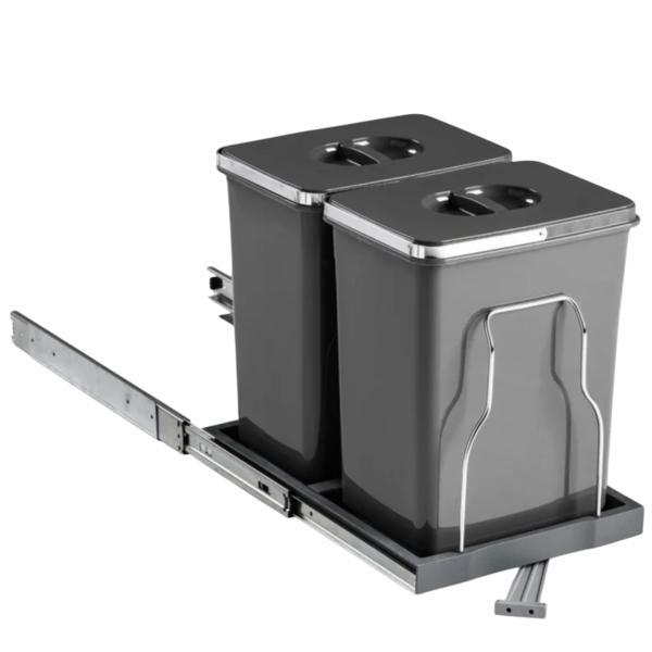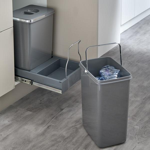 Conceput pentru colectare selectiva, sistemul integreaza doua recipiente de 15 litri, perfecte pentru separarea deseurilor menajere si reciclabile, mentinand totodata un profil compact, usor de integrat in mobilier. Cele doua recipiente sunt detasabile, prevazute cu manere integrate pentru o manipulare sigura si o golire rapida.
