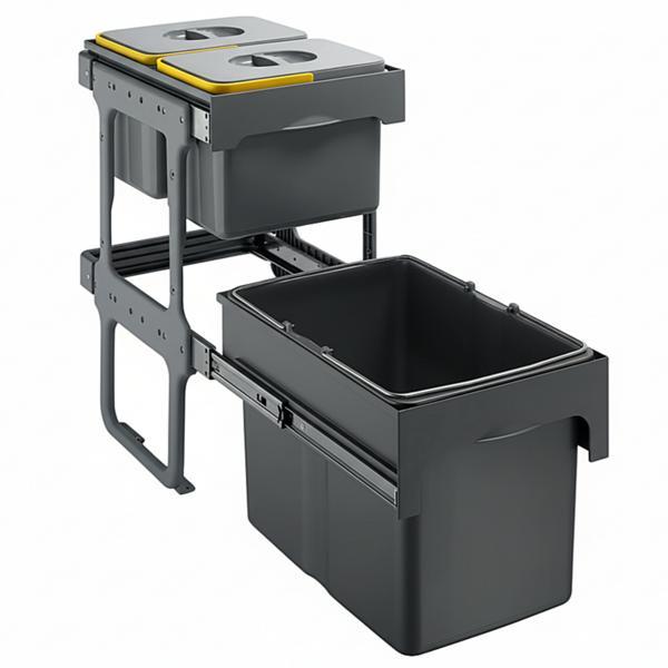 Structura metalica robusta si mecanismul de glisare permit extinderea ansamblului in doua trepte, astfel incat fiecare nivel devine usor accesibil si perfect organizat. Fiecare recipient este detasabil, prevazut cu manere integrate pentru manipulare rapida, iar capacele colorate faciliteaza identificarea imediata a tipului de deseuri, oferind un flux de lucru clar si intuitiv.