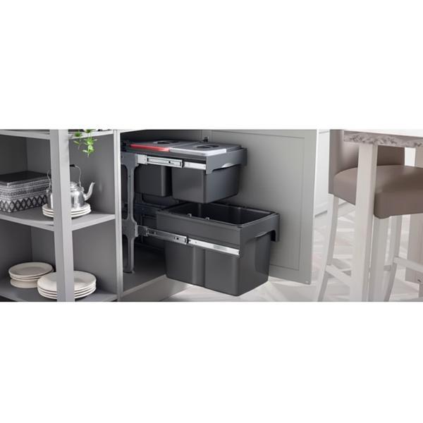Configuratia sa inteligenta combina un compartiment de 34 litri cu alte doua de 12 litri, creand un sistem perfect echilibrat pentru sortarea precisa a deseurilor menajere si reciclabile.