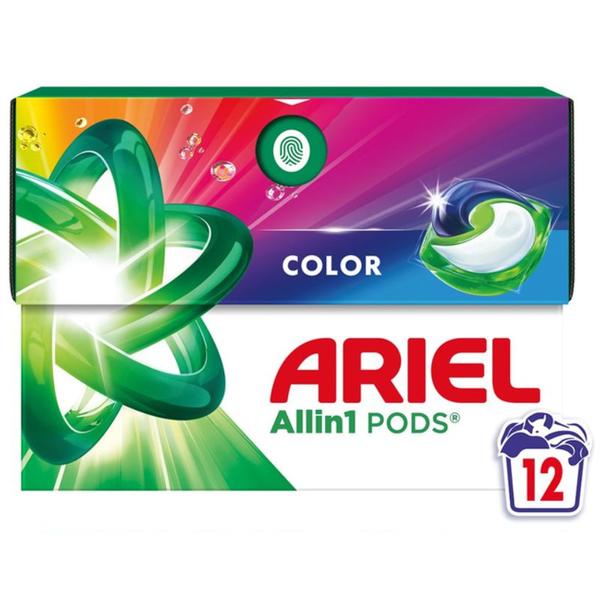 Detergent Automat Capsule - Ariel All in 1 Pods Color, 12 buc: capsule de detergent automat special concepute pentru spalarea rufelor colorate, oferind o curatare eficienta si protejand intensitatea culorilor. Formula All-in-1 combina mai multe tehnologii de curatare intr-o singura capsula, indepartand murdaria si petele dificile chiar si in apa rece sau in cicluri scurte de spalare. Designul multi-compartimentat mentine ingrediente separat pana in momentul utilizarii, iar invelisul capsulei se dizolva rapid si complet la contactul cu apa, fara a lasa reziduuri. Lasa rufele curate, proaspete si cu culori vizibil mai intense dupa fiecare spalare.