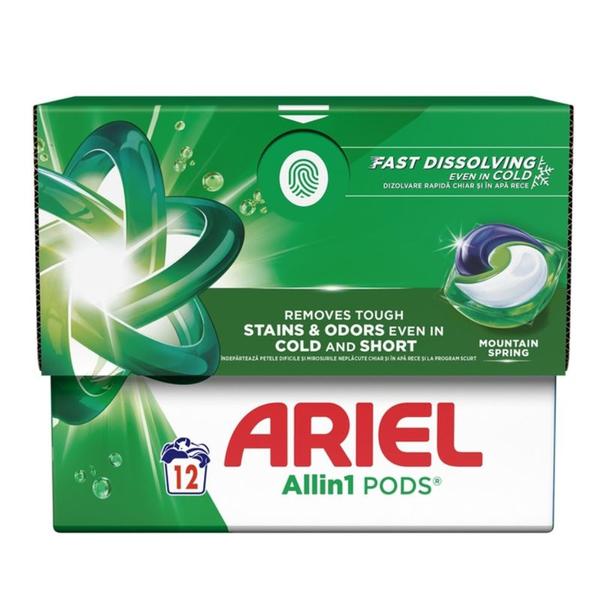 Detergent Automat Capsule - Ariel All in 1 Pods Mountain Spring Fast Dissolving, 12 buc: capsule cu detergent automat concepute pentru a indeparta eficient petele dificile si mirosurile neplacute, chiar si in apa rece sau in cicluri scurte de spalare. Formula All-in-1 combina mai multe tehnologii de curatare intr-o singura capsula, oferind rezultate excelente dintr-o singura spalare. Designul multi-compartimentat mentine ingredientele separate pana la momentul utilizarii, iar invelisul capsulei se dizolva rapid si complet la contactul cu apa, fara a lasa reziduuri. Parfumul fresh Mountain Spring lasa rufele curate si placut parfumate dupa fiecare spalare.