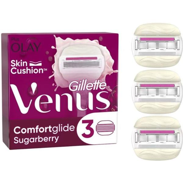 Rezerve Aparat de Ras pentru Femei - Gillette Venus Comfortglide Sugarberry Plus Olay, 3 buc: rezerve pentru aparatul Gillette Venus Comfortglide Sugarberry, concepute pentru un ras delicat si confortabil. Fiecare rezerva este prevazuta cu 5 lame pentru un ras neted si benzi de gel hidratante, activate la contactul cu apa, care ajuta la reducerea iritatiilor si elimina necesitatea folosirii gelului de ras separat. Parfumul dulce-fructat sugarberry ofera o experienta placuta la fiecare utilizare. Compatibile cu manerele Venus Comfortglide.