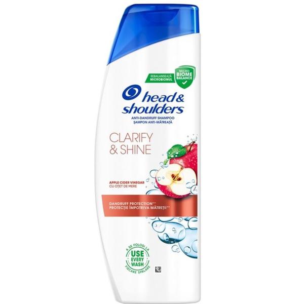 Sampon Antimatreata cu Otet de Mere - Head&Shoulders Anti-dandruff Shampoo Clarify & Shine Apple Cider Vinegar, 330 ml: sampon antimatreata conceput pentru a curata eficient scalpul si a reda stralucirea naturala a parului, potrivit atat pentru barbati, cat si femei. Formula sa imbogatita cu otet de mere ajuta la indepartarea impuritatilor si a excesului de sebum, oferind o senzatie de prospetime si par vizibil mai curat. Tehnologia Microbiome Balance contribuie la mentinerea echilibrului scalpului si ofera protectie eficienta impotriva matretii. Parul ramane usor, stralucitor si revitalizat, fiind potrivit pentru utilizare zilnica. Produs testat dermatologic, cu pH echilibrat.