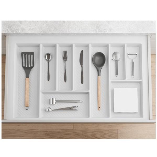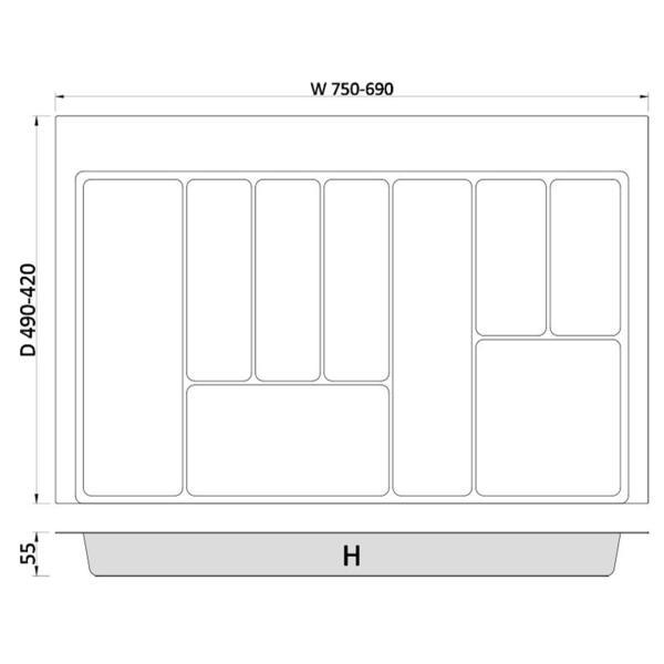 Conceput pentru sertarele cu latimea exterioara de 800 mm, modelul se potriveste sertarelor cu adancimea de 450–500 mm. Datorita designului flexibil, acest suport de organizare pentru tacamuri poate fi ajustat cu usurinta, marginile se pot taia astfel incat dimensiunile sa se potriveasca in intervalul 750–690 mm si 490–420 mm. Astfel, produsul se adapteaza chiar si mobilierului realizat pe masuri speciale.