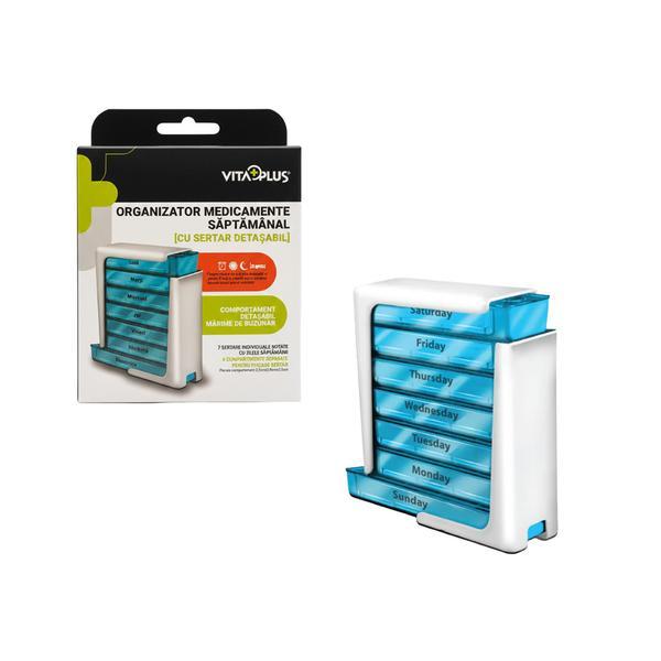 Organizator medicamente saptamanal VitaPlus, cu 7 sertare detasabile, design compact si portabil