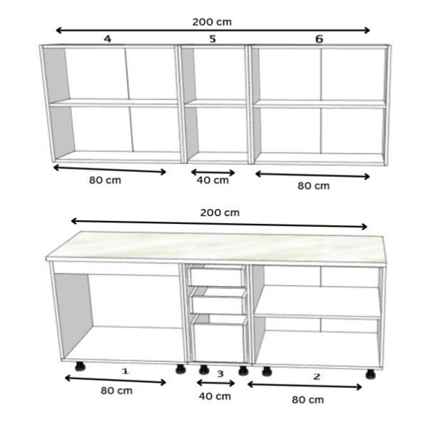 • 3 corpuri superioare: 80 cm cu 2 uși, 80 cm cu 2 uși, 40 cm cu o ușă