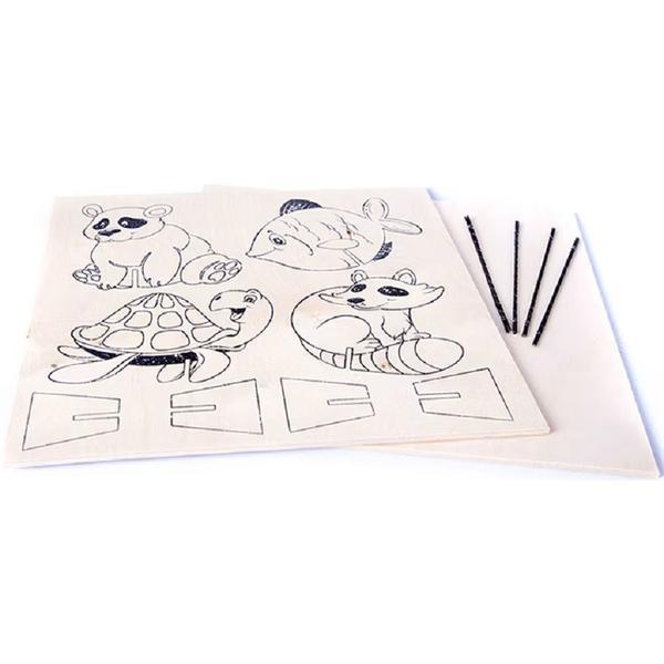 Rezerva set de traforaj: Această rezervă pentru setul de traforaj este ideală pentru copiii pasionați de activități creative și lucrul manual. Conține planșe din placaj pe care sunt imprimate modele simpatice de animale – ursuleț, peștișor, broască țestoasă și raton - perfecte pentru a fi traforate, decupate și ulterior decorate după imaginația celor mici.